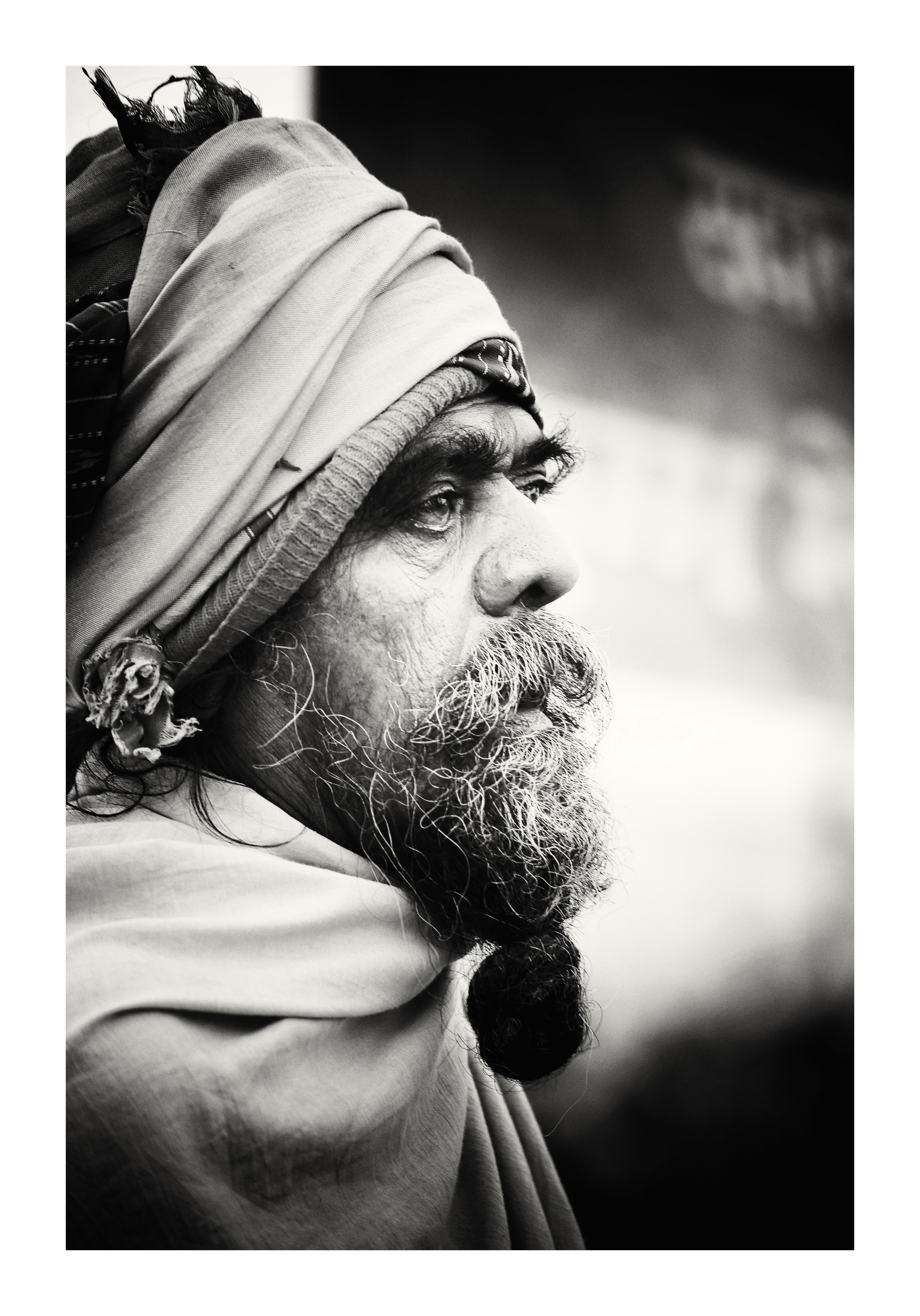 The vermillion tilaki can just be seen on the forehead of this bearded pilgrim below. He had the most extraordinary face. He tied his headwear with very fluent, stylish flair, and in the corner is the ragged end of a piece of fabric that I initially mistook for a live flower. Fabric replicating nature. He was waiting for his spiritual baba to lead the procession to bathe in the River Ganges.